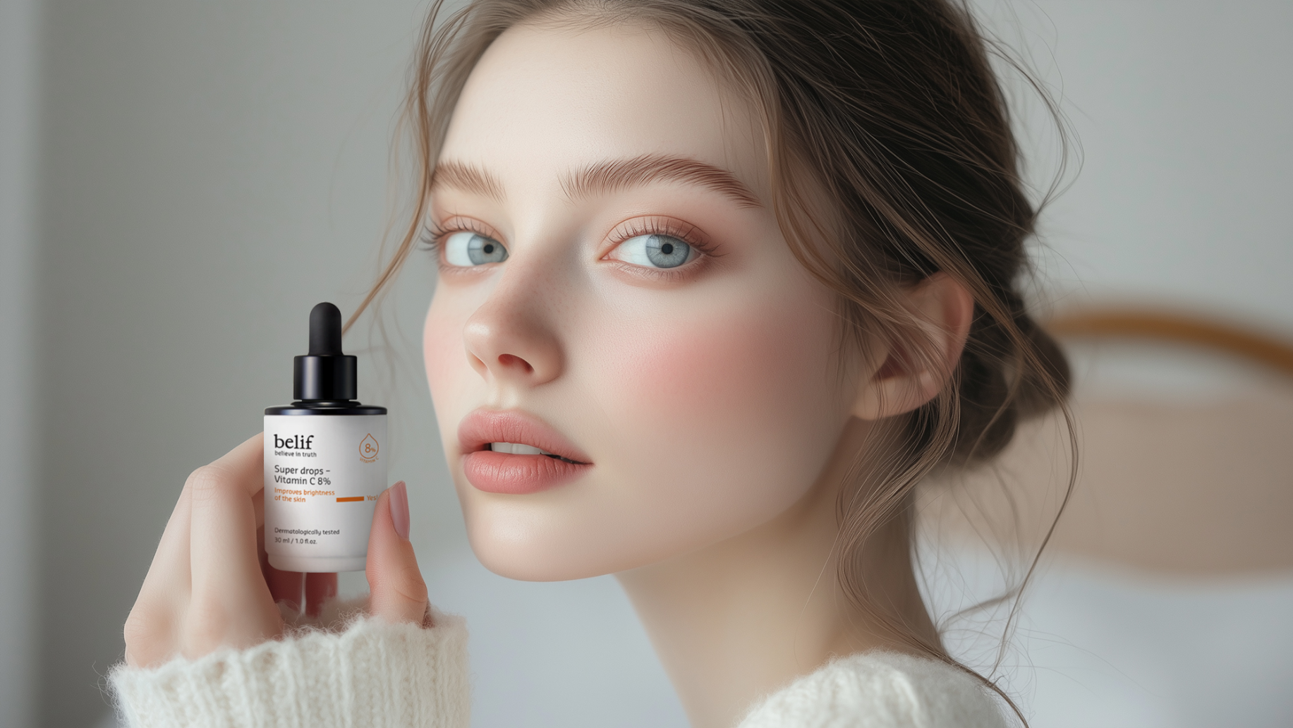 비타민C 공급으로 얼굴을 환하게 밝혀주고, 눈부신 피부 광채의 느낌을 포근한 스웨터와 함께 겨울 시즌에 맞추어 모델을 연출