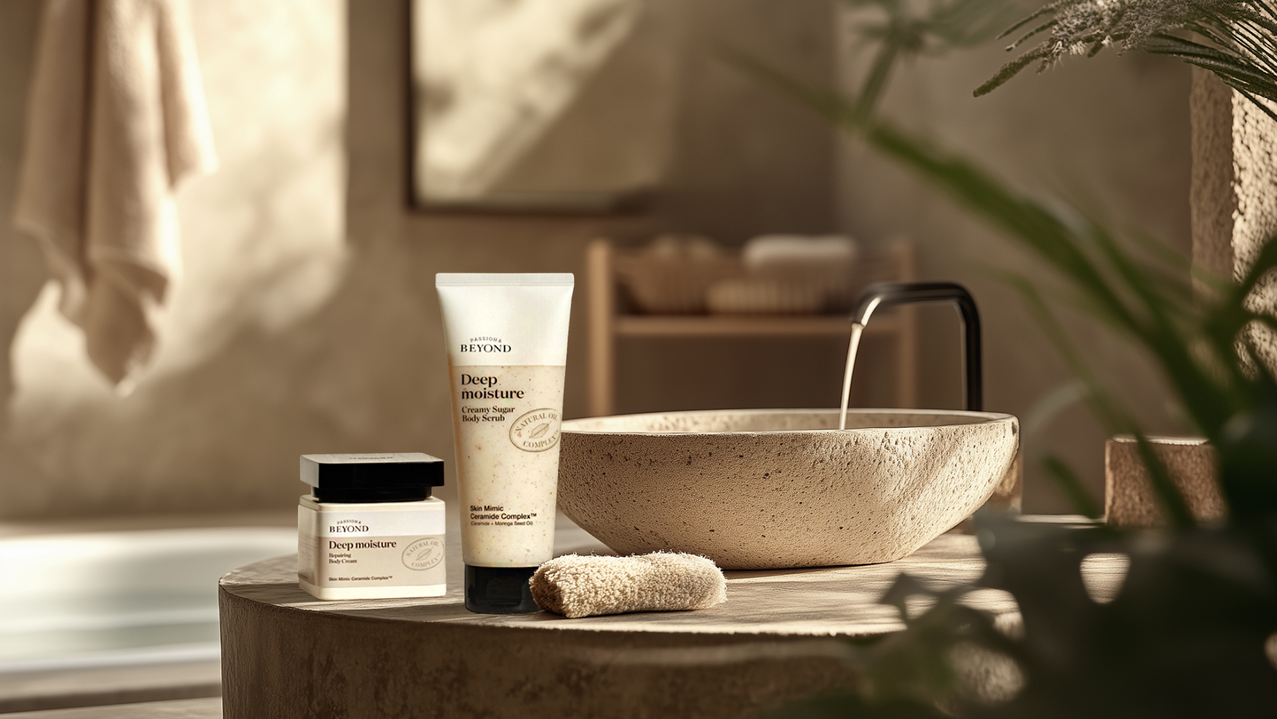 메마른 일상에 촉촉함을 주는 건강한 바디 보습케어 라인과 자연 친화적인 브랜드 철학에 어울리는 bathroom으로 연출