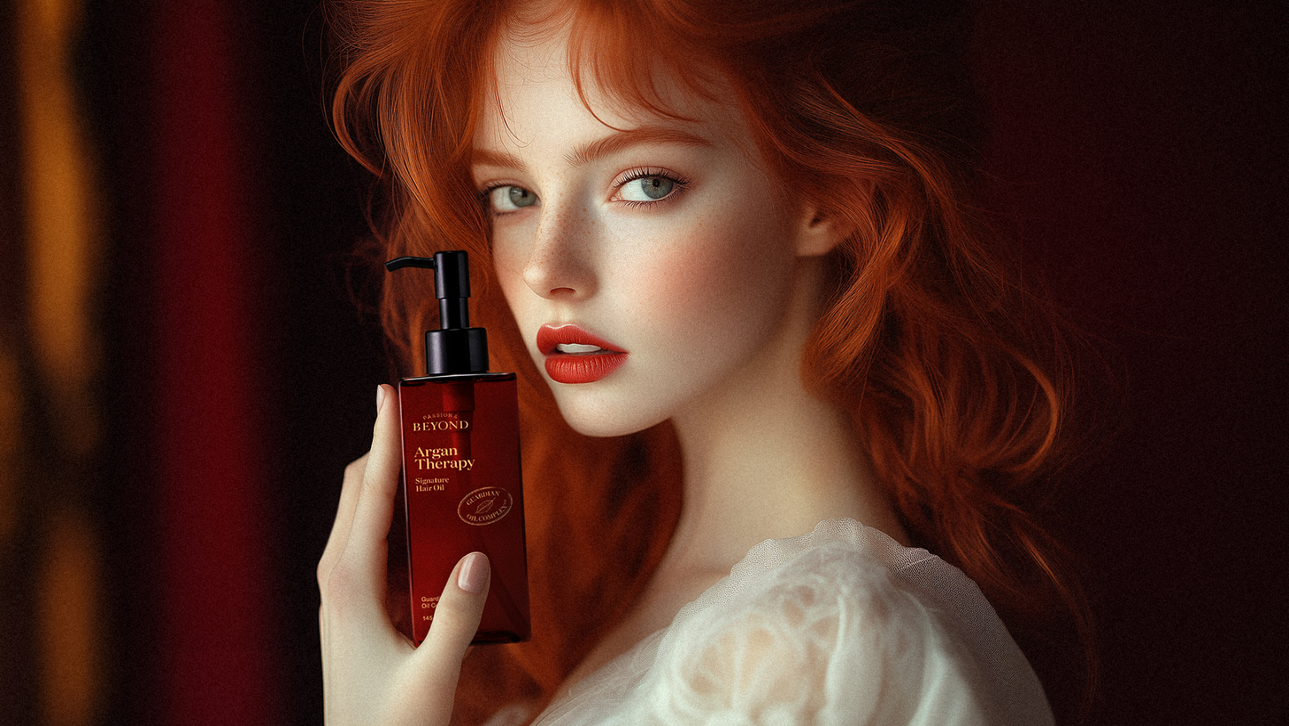 극손상 모발용 테라피 헤어 오일 제품을 예민해 보이는 모델과 긴장감으로 연출