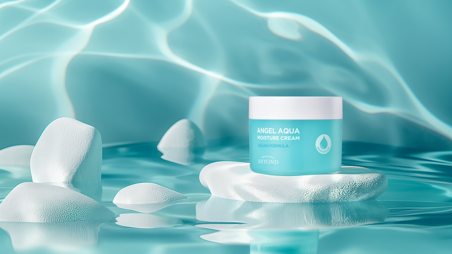 수분 가득 비건 포뮬러, 수분 진정의 완성, 수분 제품에 맞추어 아쿠아 컨셉으로 연출