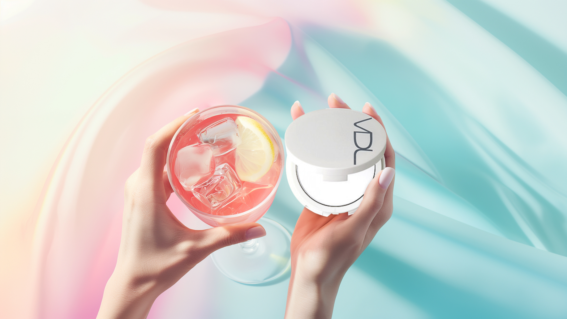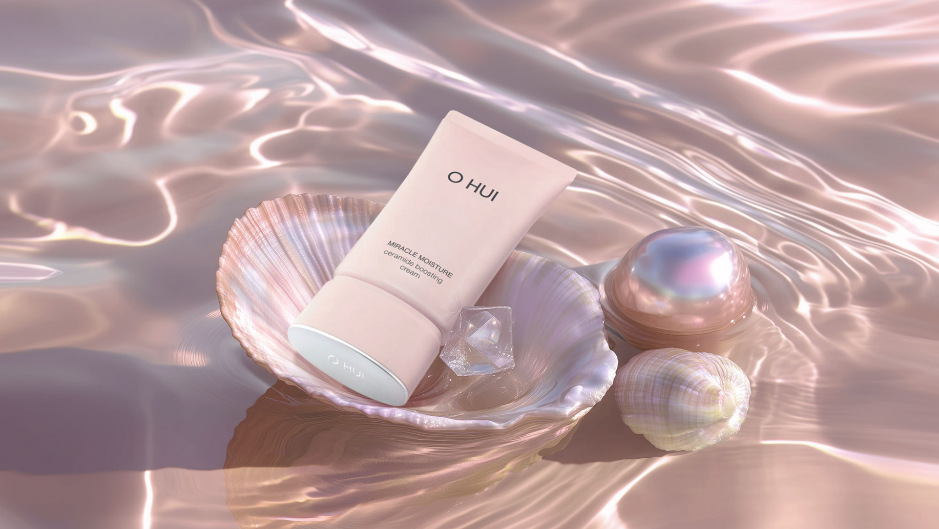 영원히 빛나는 아름다움을 선사하는 브랜드 컨셉과 핑크빛 보습 제품에 맞추어 물에 반사되는 핑크빛과 제품을 연출