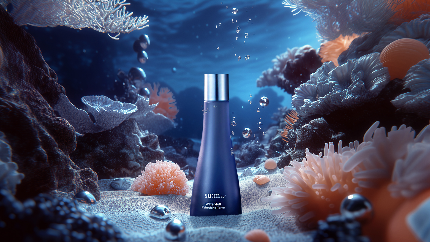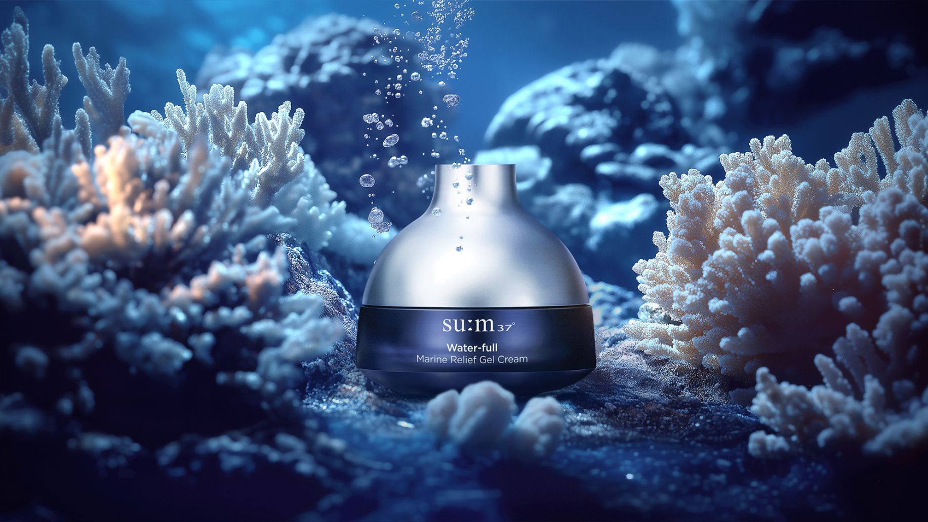 천혜의 자연을 그대로 간직한 깊고 고요한 바닷속의 생명력, 바다 환경을 이겨낸 강인한 성분을 모아 완성된 제품의 컨셉에 맞추어 연출