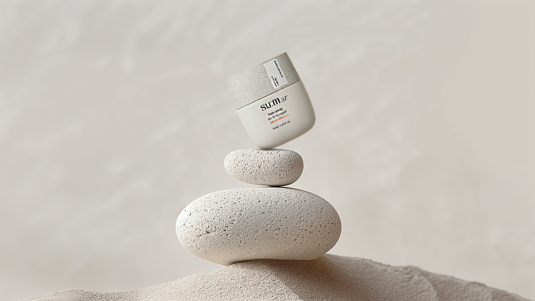 조약돌이라는 자연에서 영감을 받은 색상과 질감이 표현된 제품 패키지의 둥근 느낌을 모래 위 조약돌과 함께 연출