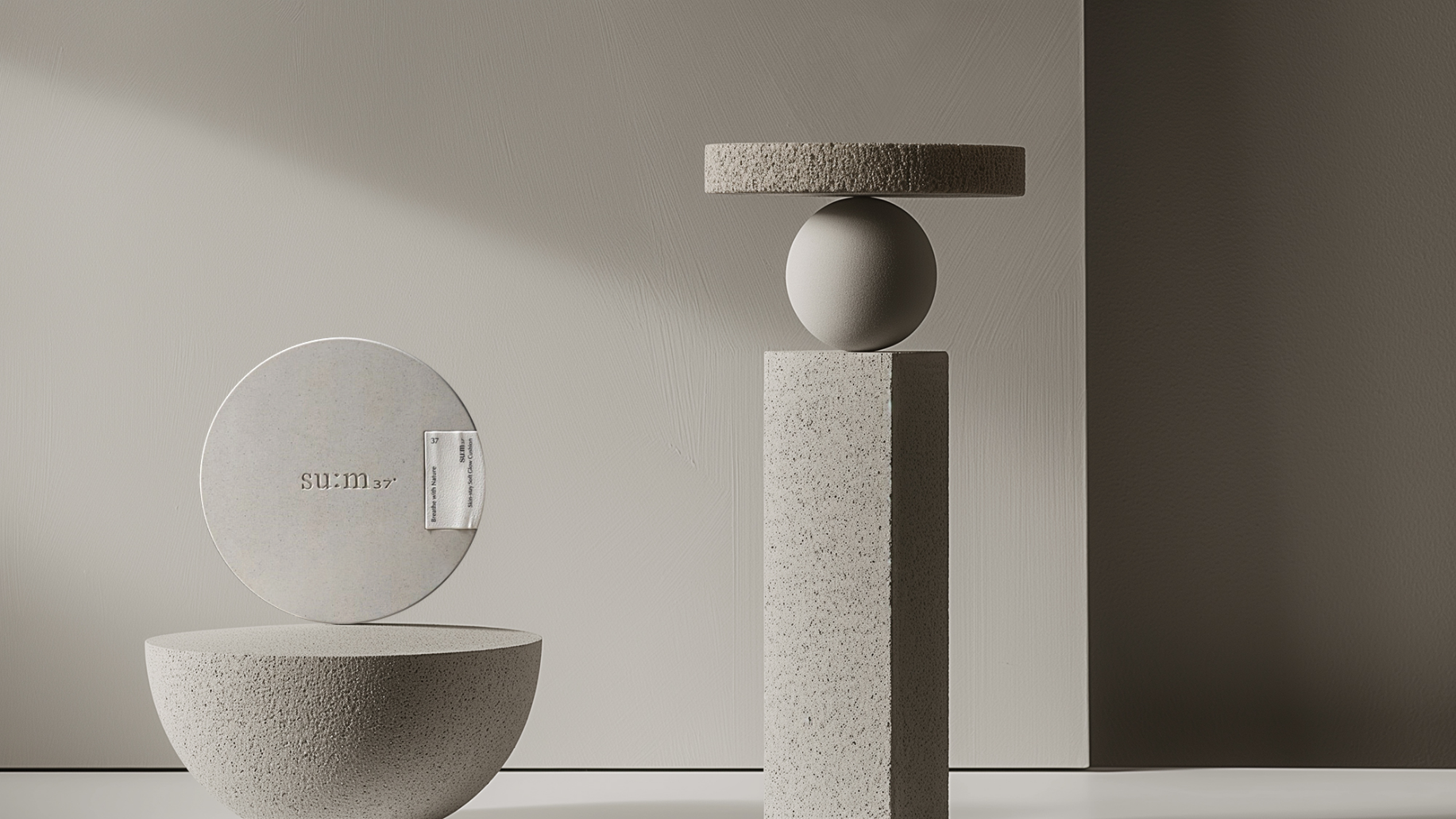브랜드 철학에 맞추어 자연 친화적인 포장재를 사용한 글로우 쿠션 제품과 균형감 있게 도형들을 연출
