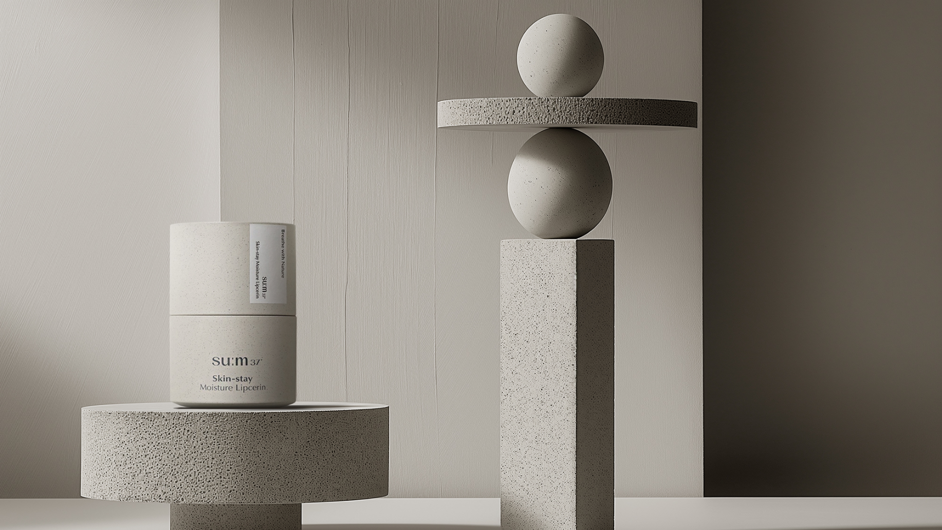 브랜드 철학에 맞추어 자연 친화적인 포장재를 사용한 립세린 제품과 균형감 있게 도형들을 연출
