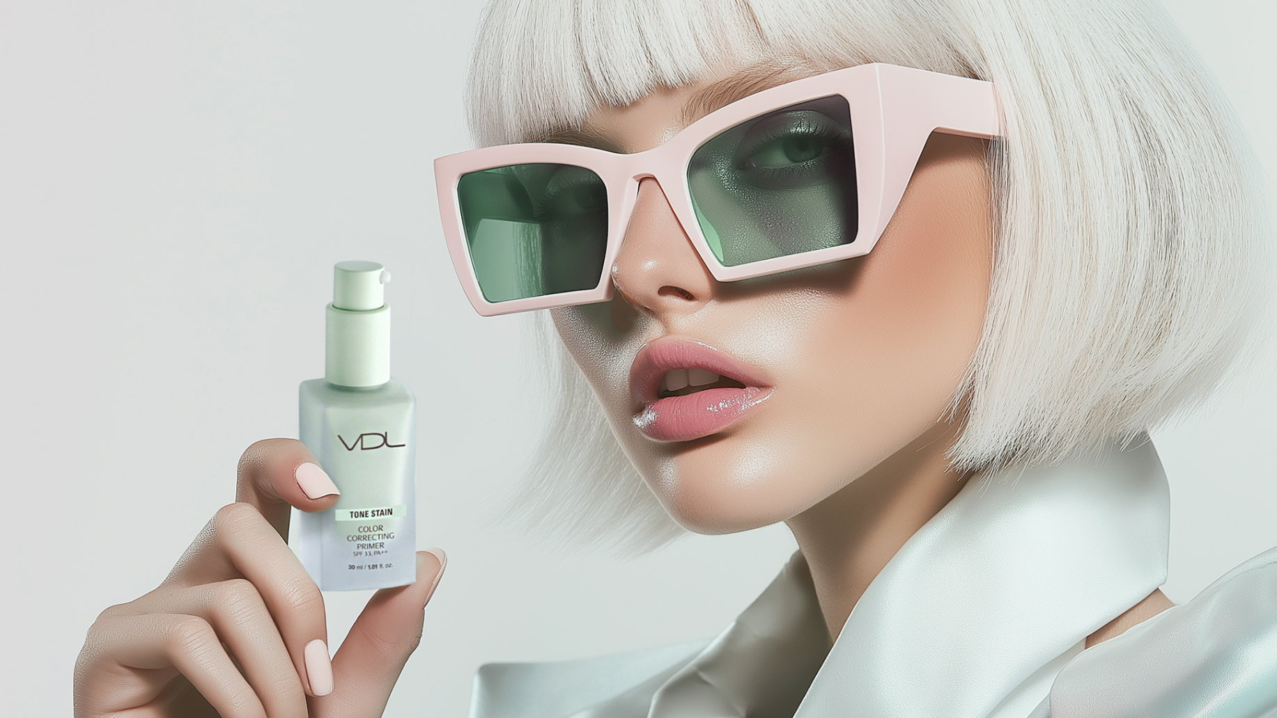 썬크림과 여름 풀의 시즈널 한 연출, 흰색 단발에 핑크색 안경을 쓰고 있는 힙한 제품 모델, 주근깨가 있고 분홍빛 피부를 가진 10대 백인 소녀, 심해의 수분 에너지를 담은 제품을 위한 바닷속 연출 등,