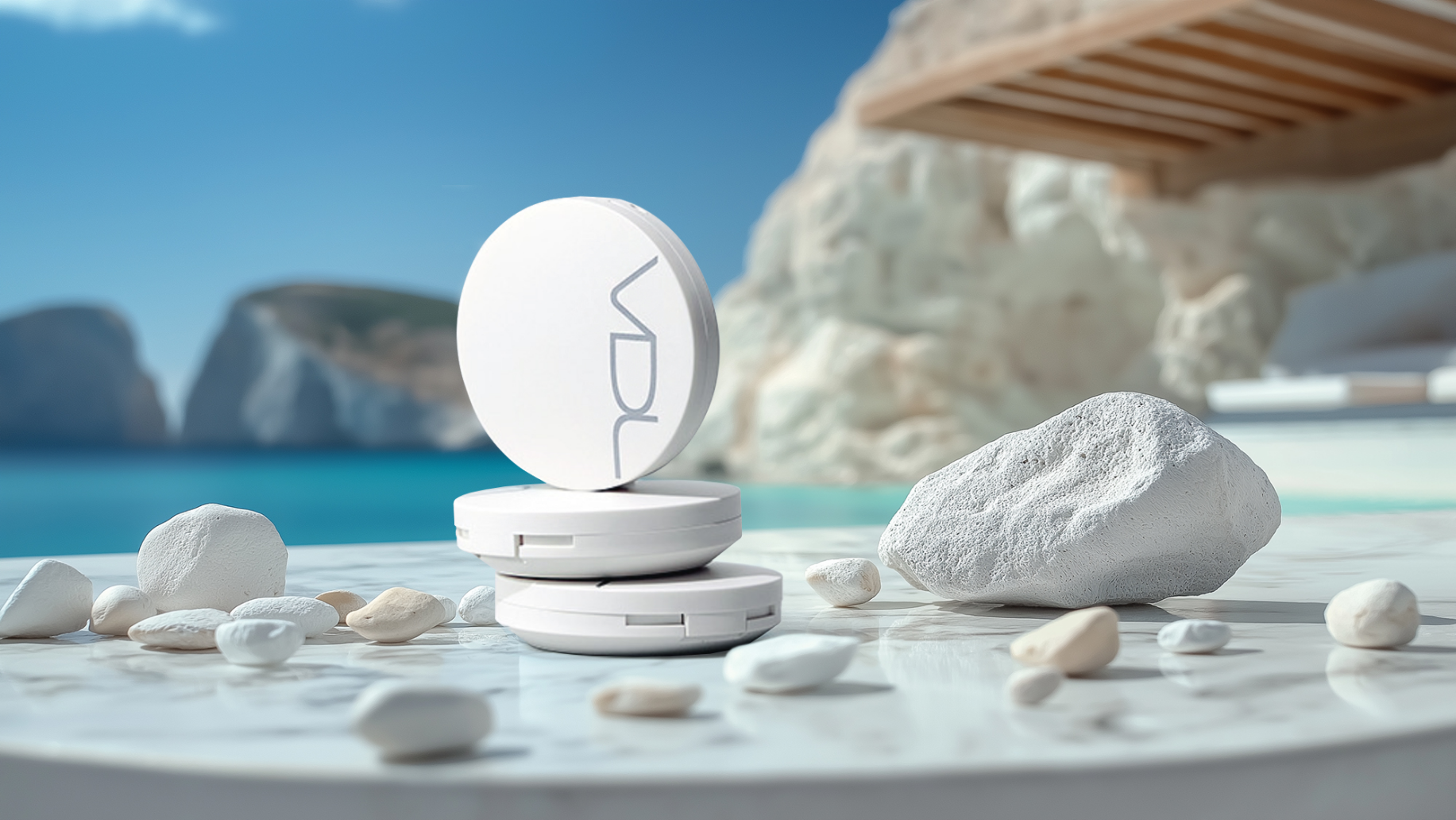 지중해 햇살이 따갑게 비추는 휴양지에 자외선 차단 기능이 있는 선 팩트 제품을 위한 연출