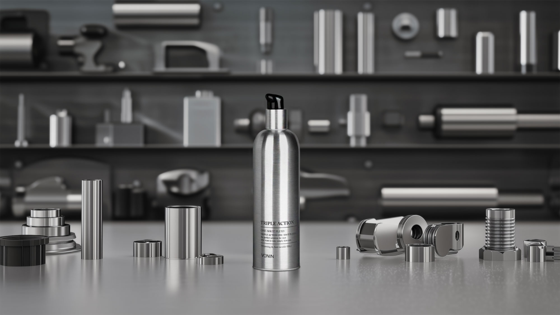 공기 노출을 최소화 한 알루미늄 이중 용기에 디스 펜스형 용기라서 위생적이며, 고급스러운 메탈 재질에 MAN’S STYLE 제품과 소품들로 연출